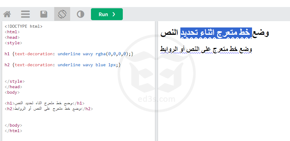 <!DOCTYPE html> <html> <head> <style> h1 {text-decoration: underline wavy rgba(0,0,0,0);} h2 { text-decoration: underline wavy blue 1px; } </style> </head> <body> <h1>وضع خط متعرج اثناء تحديد النص</h1> <h2>وضع خط متعرج للنص او الروابط بشكل دائم</h2> </body> </html> |
